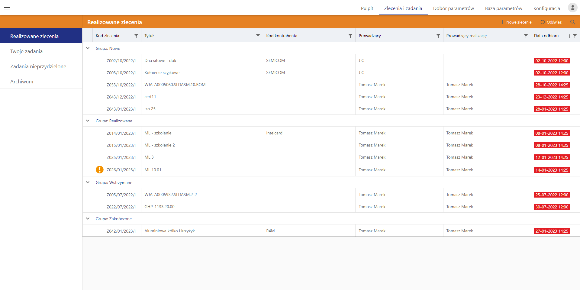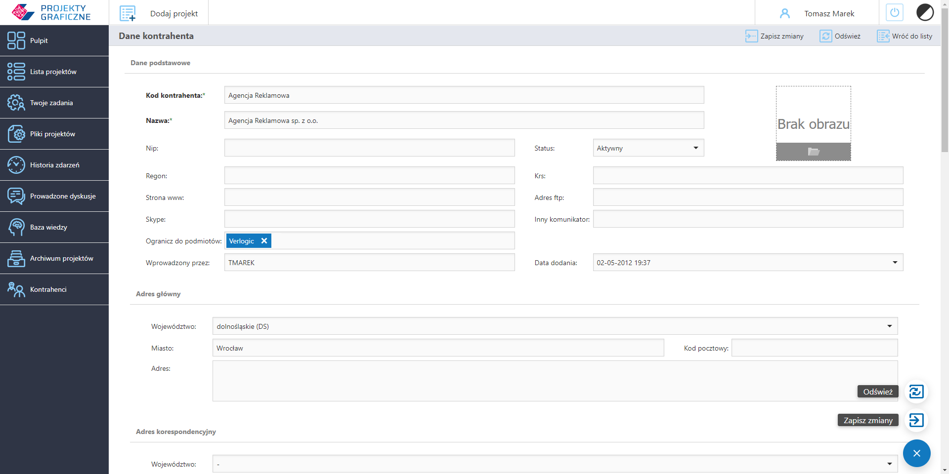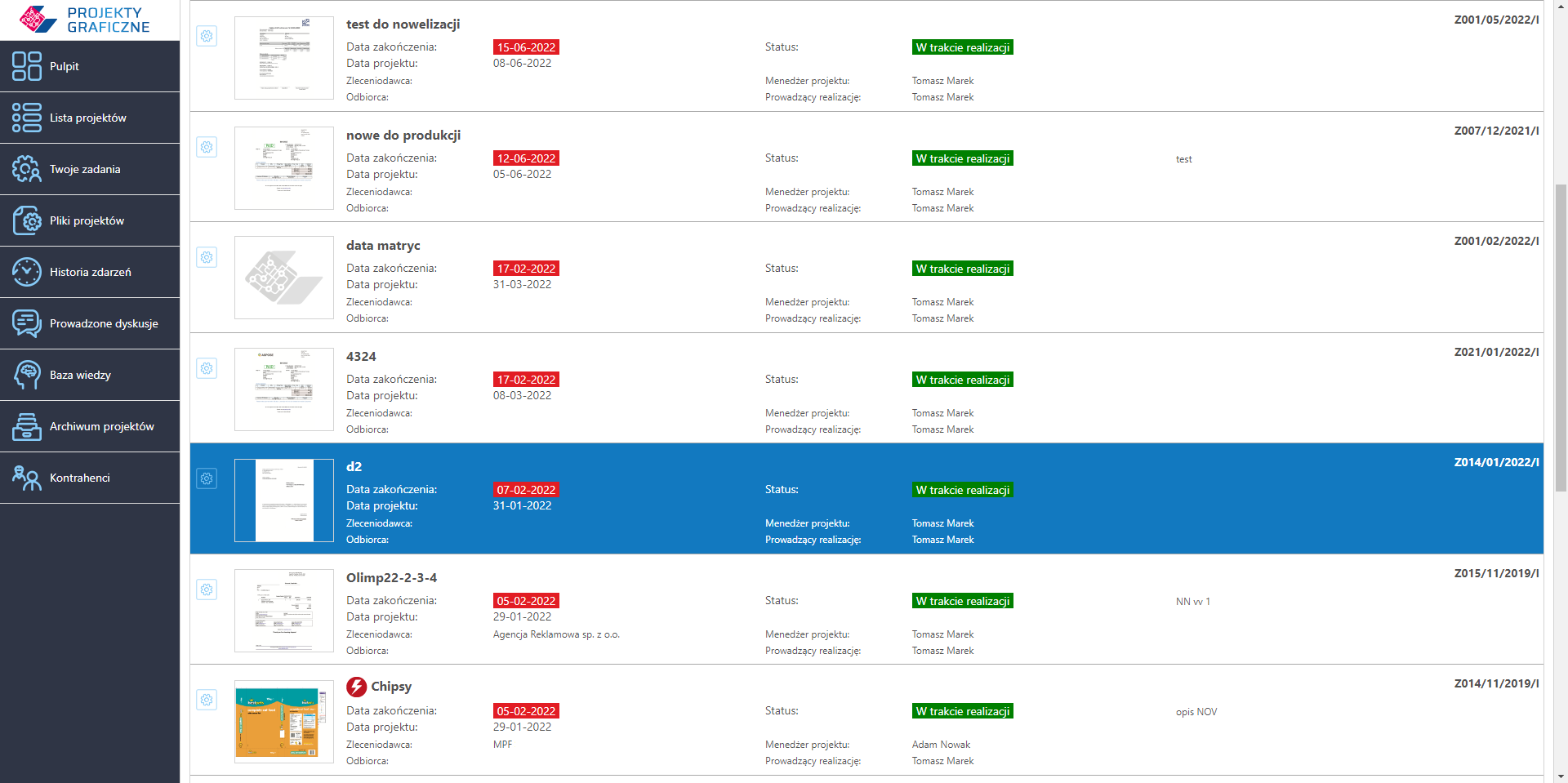 - Możliwość dodania kontrahentów do procesu realizacji zleceń / projektów poprzez nadanie im możliwości dodawania zamówień, akceptacji wybranych etapów realizacji zlecenia, dodawania plików